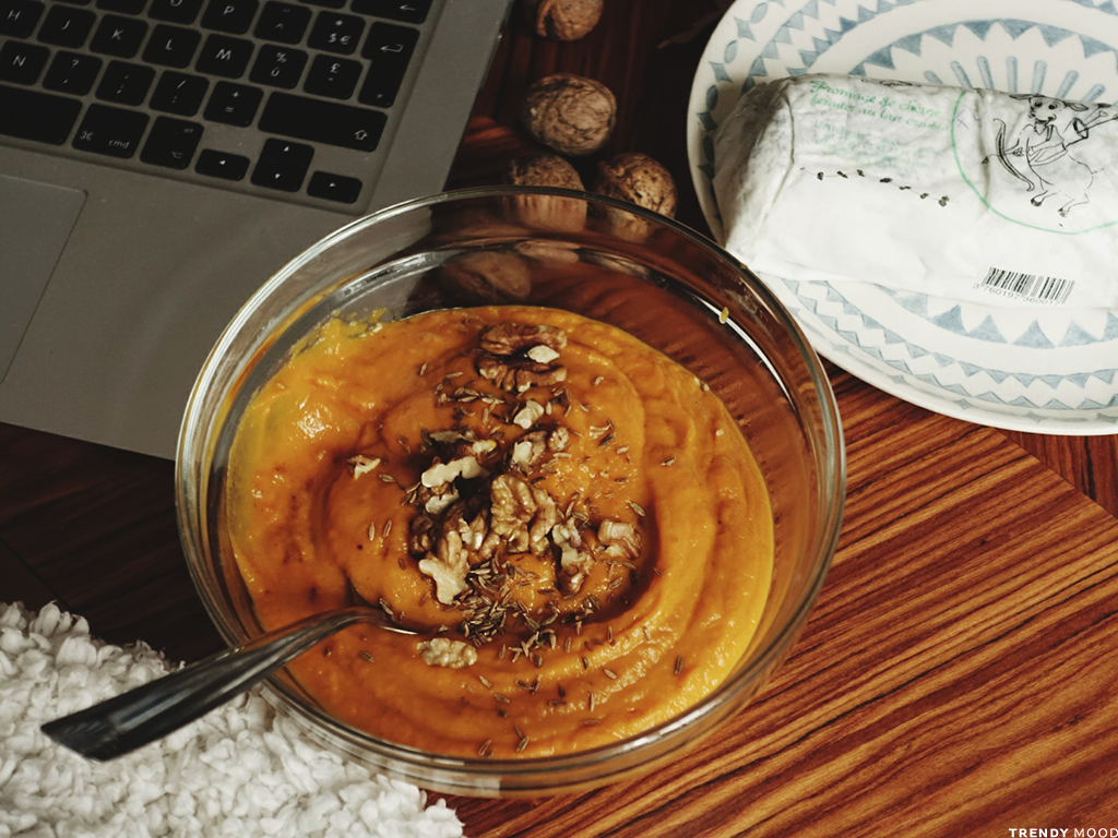 6 – Servez la purée avec 1 pincée de cumin et de gros sel sur le dessus, les noix et rapez en très fines lamelles le fromage de chèvre par dessus (comme du parmesan). Calfeutrez-vous dans un gros plaid et régalez-vous en regardant Downton Abbey !