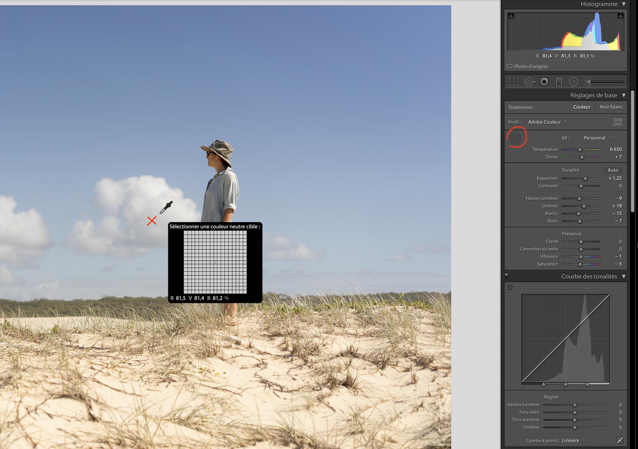 3. On règle la balance des blancs grâce à l’outil « pipette ». Il faut la placer sur un endroit neutre de la photo, un gris ou un blanc de référence. En général, il faut ensuite ajuster un peu.
