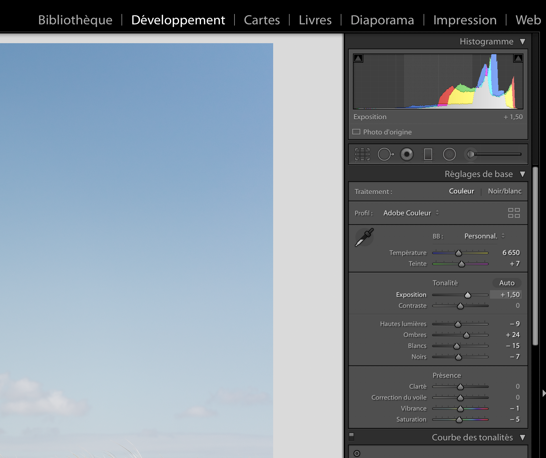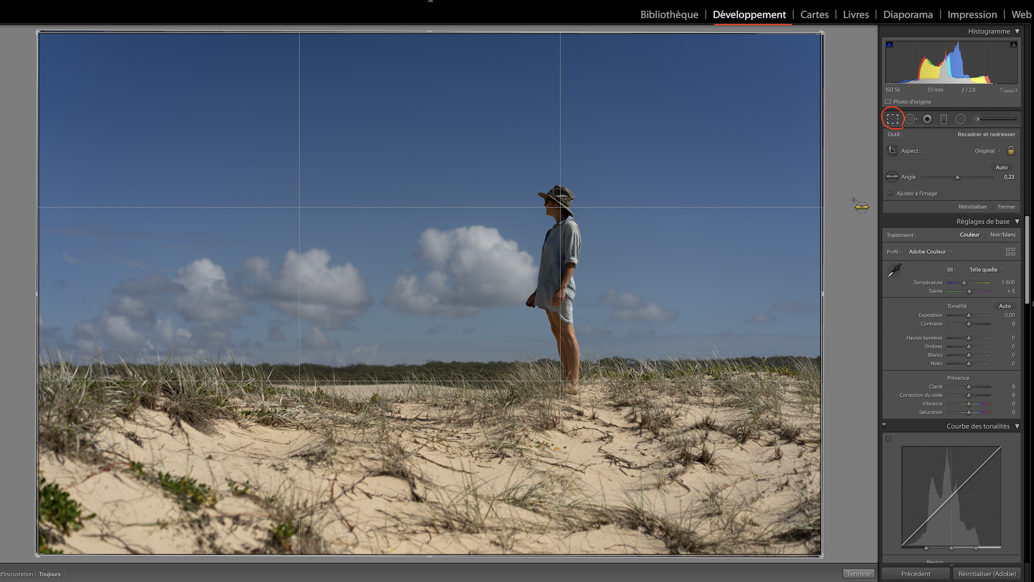 1. On va dans l’onglet « Développement » de Lightroom et on recadre / redresse la photo si nécessaire.